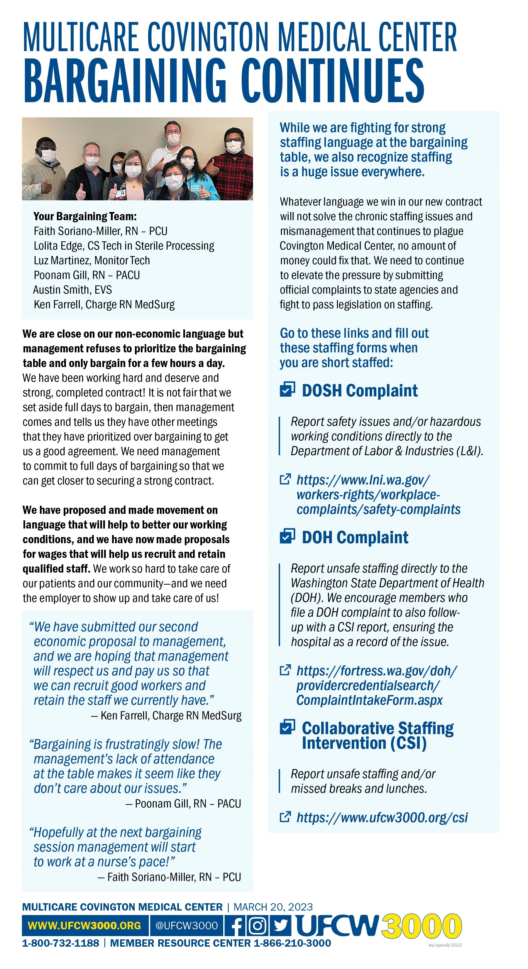 Whatever language we win in our new contract will not solve the chronic staffing issues and mismanagement that continues to plague Covington Medical Center, no amount of money could fix that. We need to continue to elevate the pressure by submitting official complaints to state agencies and fight to pass legislation on staffing.