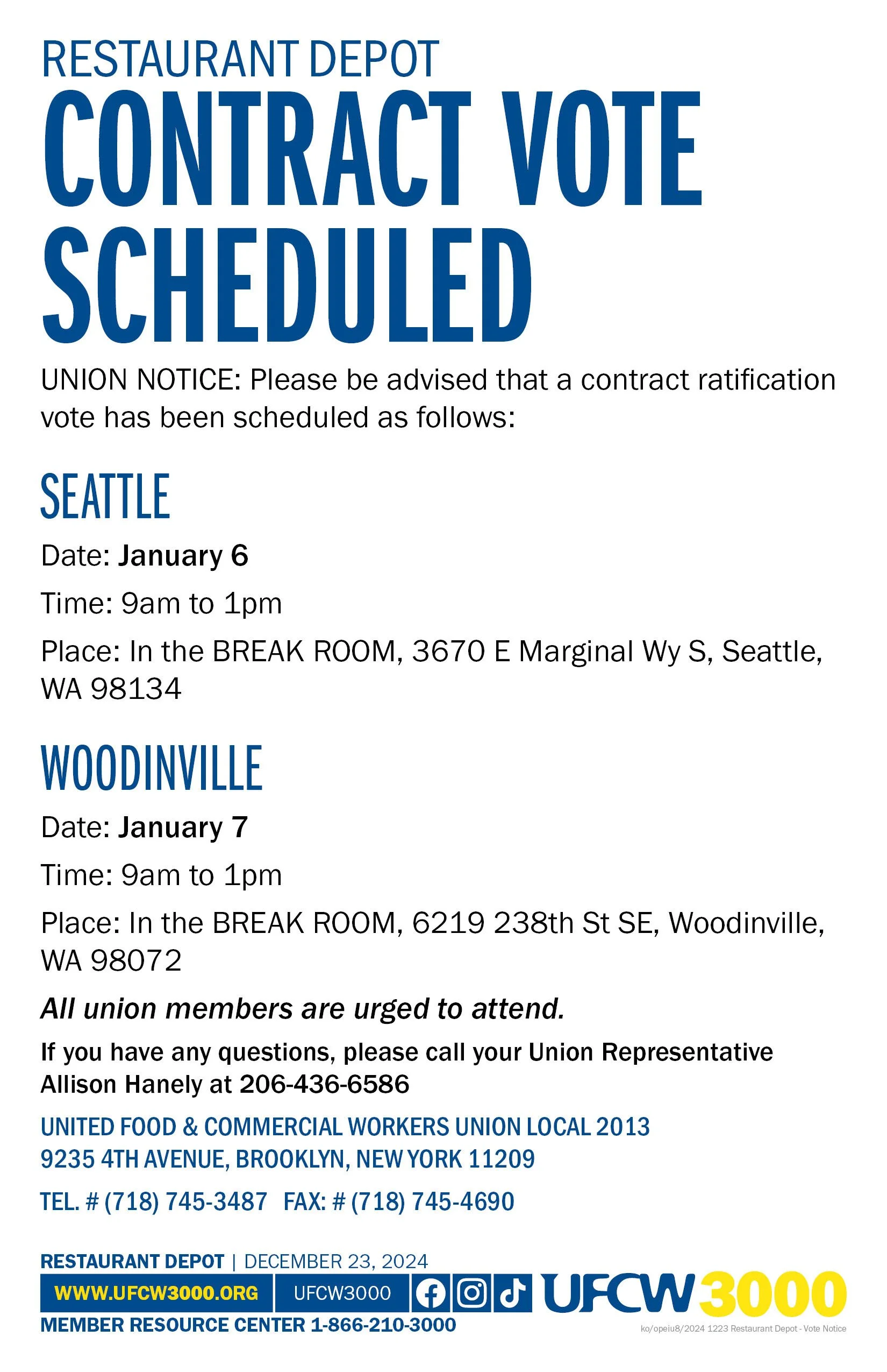/UNION NOTICE: Please be advised that a contract ratification vote has been scheduled as follows: