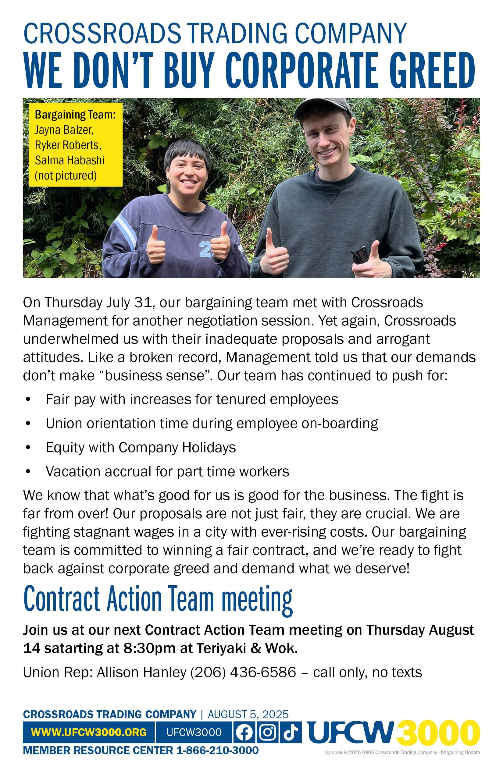 /On Thursday July 31, our bargaining team met with Crossroads Management for another negotiation session. Yet again, Crossroads underwhelmed us with their inadequate proposals and arrogant attitudes. Like a broken record, Management told us that our demands don’t make “business sense”. Our team has continued to push for: