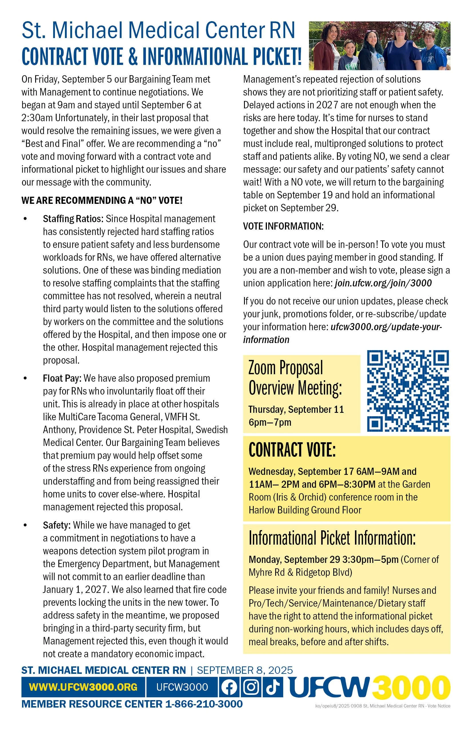 Management’s repeated rejection of solutions shows they are not prioritizing staff or patient safety. Delayed actions in 2027 are not enough when the risks are here today. It’s time for nurses to stand together and show the Hospital that our contract must include real, multipronged solutions to protect staff and patients alike. By voting NO, we send a clear message: our safety and our patients’ safety cannot wait! With a NO vote, we will return to the bargaining table on September 19 and hold an informational picket on September 29.