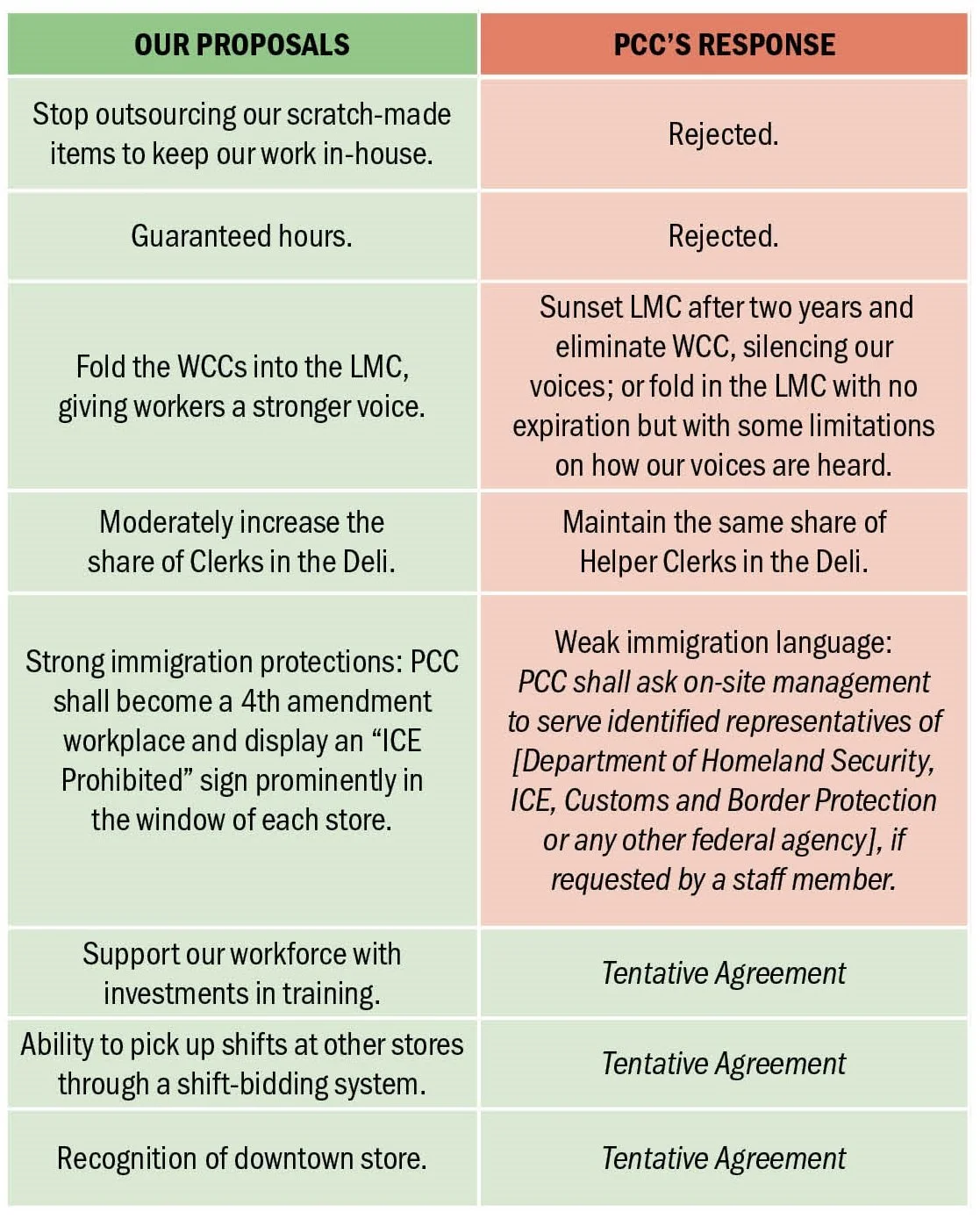 Despite winning three more Tentative Agreements, we still need to win guaranteed hours and increased pay for helper clerks and Journeypersons. We still need to maintain our affordable health care, limit outsourcing in our stores, strengthen democratic governance with a robust Labor Management Committee, and provide safeguards if the federal government surges ICE agents into the communities we serve.
