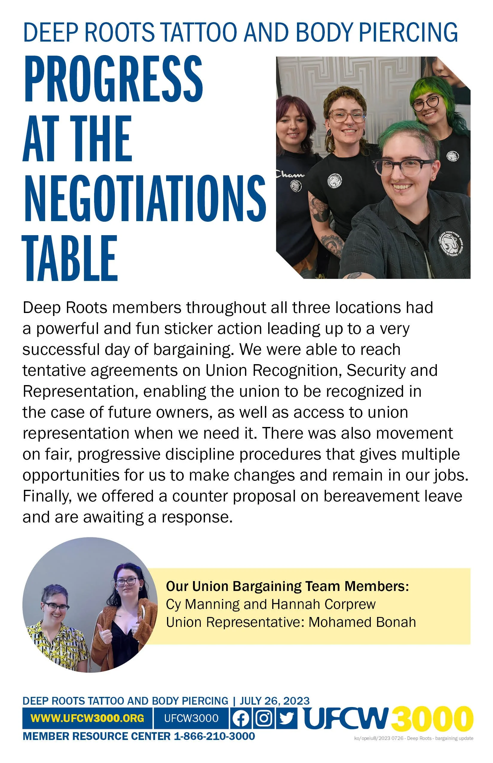 Today we came prepared to negotiate all day but shortened our session due to health reasons of the Deep Roots bargaining team. Nevertheless, we made meaningful progress on bereavement, inclement weather, and seniority! We won the inclusion of close friends, people residing with the employee, and pets in bereavement leave, and are continuing to push for more paid time. We also are proud to have reached a tentative agreement today on our Grievance Procedure which will allow us to have a process to challenge unfair discipline, pay discrepancies, and other violations of our Union contract.