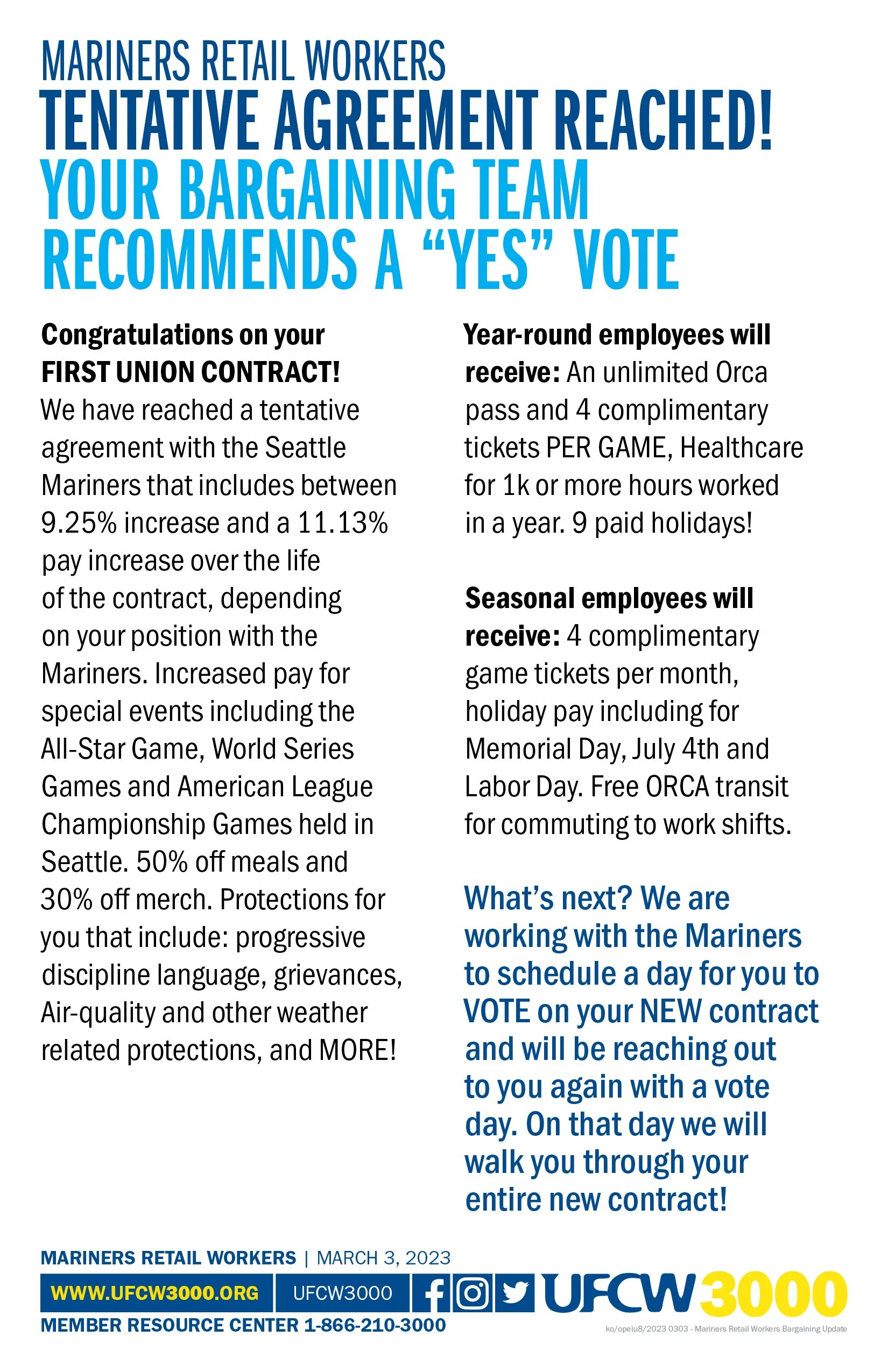 You and your coworkers deserve to have subsidized parking and promotional giveaways restored. It is unfortunate that the timeline for a resolution has not been quicker. The game-to-game impact of additional commute times, expensive parking, and missing out on great promotional giveaways is why we’re fighting to secure those benefits moving forward. Pending the certification of the election results, UFCW 3000 continues to represent you and your coworkers as unionized workers, and all provisions of your CBA remain in effect. One of the provisions of our CBA includes union dues deduction and collection. We are currently inquiring our International Union to see if we can delay the collection of union dues until the Election results have been determined.